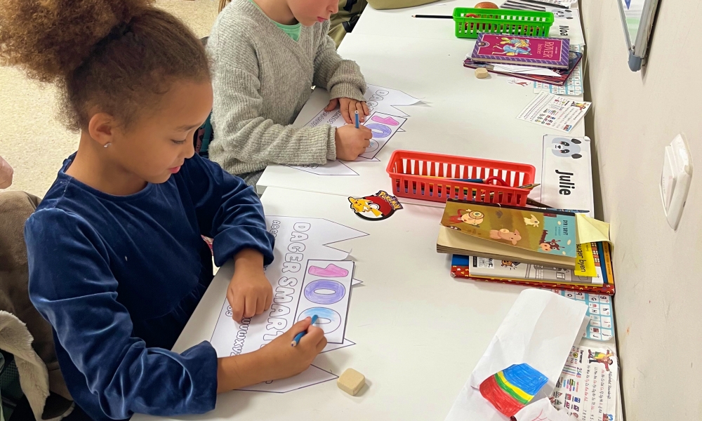 På fredag feiret 1. klasse 100 dager som 1. klassinger! Dagen ble markert med stor velkomst fra læreren på morgenen, som stod klar med ulike, morsomme aktiviteter for den store dagen.
