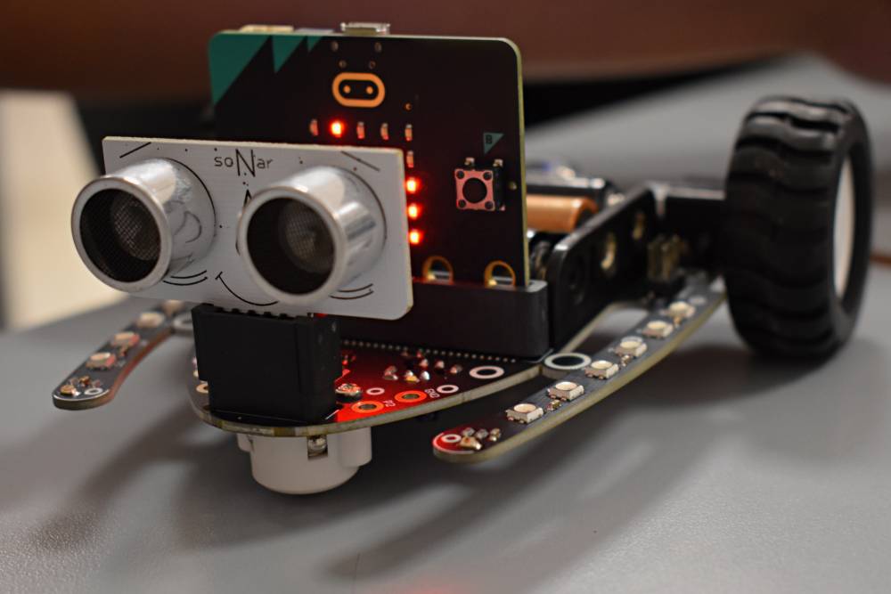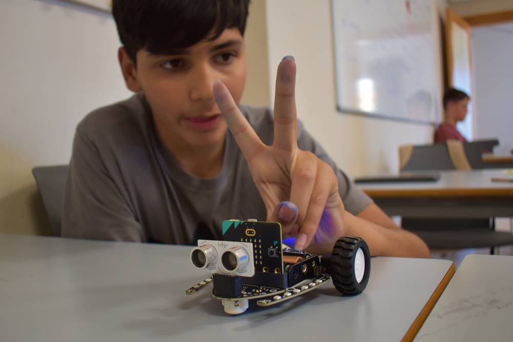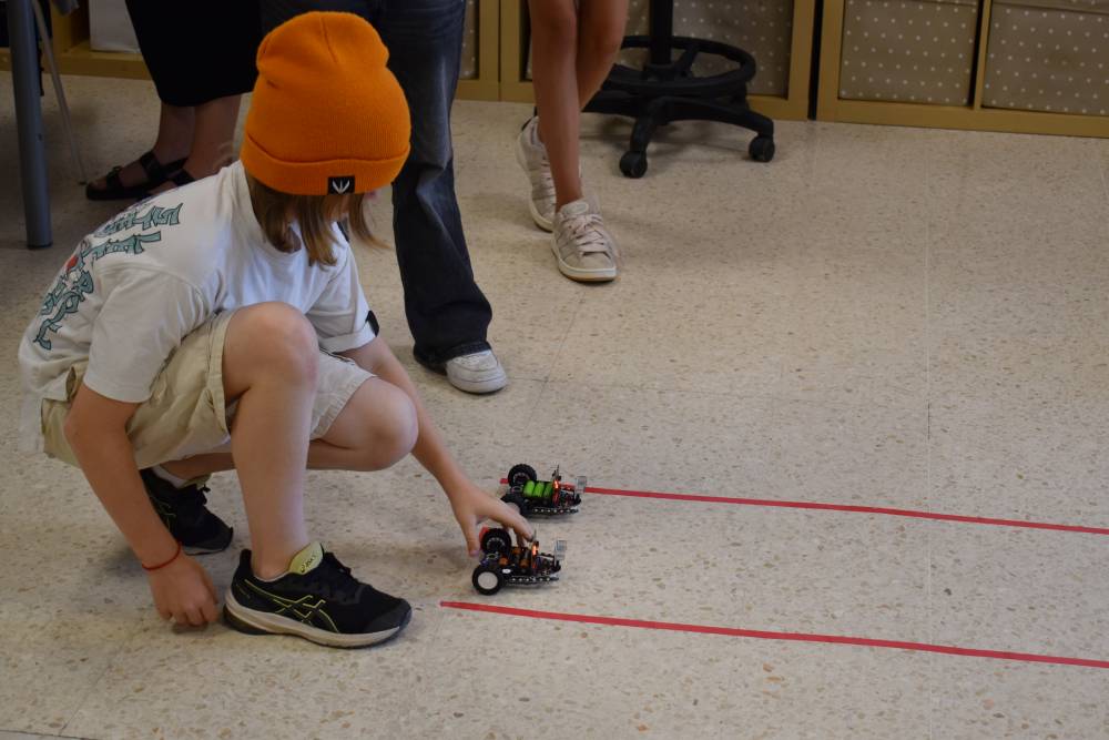 I matematikk og naturfag har 7. trinnjobbet med programmering ved hjelp av micro:bits og bit:bots. Elevene har laget egne programmer som styrer små roboter – de har fått dem til å kjøre, svinge, lyse, lage lyd og til og med følge en løype teipet opp på gulvet.