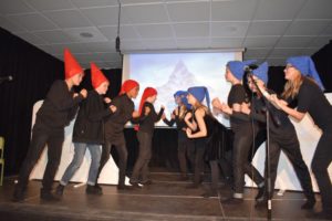 For å få plass til alle skolens foresatte og søsken, måtte elevene gjøre slik proffesjonelle sangere og skuespillere alltid gjør når det er forestilling: De måtte være «backstadge» (på bakrommet) da de ikke var på scenen. Dette var en ny vri for året. Elevene har tidligere, under øvelsene, sett alle sketsjene og hørt alle sangene, så for dem var innholdet velkjent. Med familiene som hovedgjester denne kvelden, fikk alle en plass å sitte og en god kulturopplevelse.